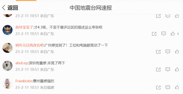 中国地震台网正式测定:02月11日10时41分在广东河源市源城区(北纬23.76度,东经114.64度)发生4.3级地震,震源深度11千米。