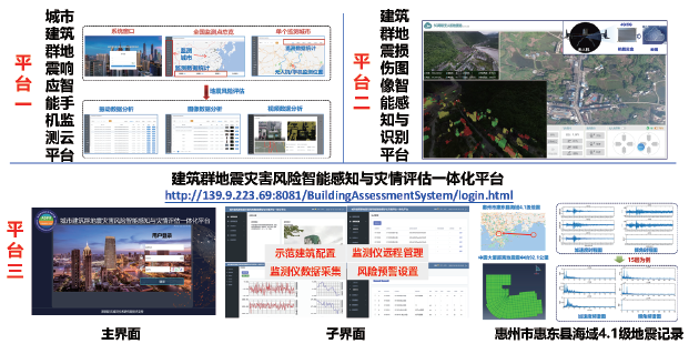 搭建了建筑群地震灾害风险智能感知与灾情评估一体化平台、城市建筑群地震响应智能手机监测云平台与建筑群地震损伤图像智能感知与识别平台,相关技术在9个城市的101栋建筑实现工程应用。