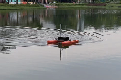 无人艇采用双体式设计,中间平台利于设备安置,便于单人操作,其续航时间≧3小时(经济航速1.5m/s)、吃水深度7cm、通信距离≧3km,可广泛应用于江、河、湖泊等水域环境,可根据实际工况场景需求,搭载多种传感器(视觉、激光雷达、声呐、水质监测)和计算单元,并以单船或多船协同的形式执行水质监测、水底探测等复杂任务。